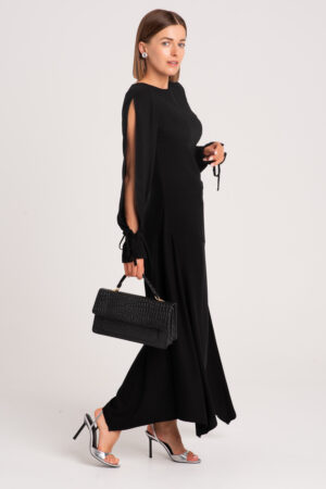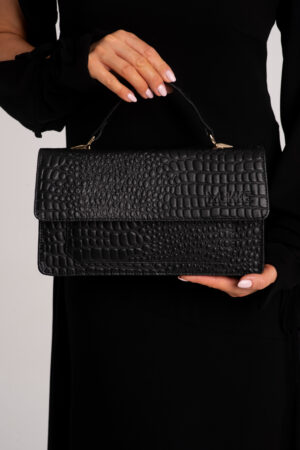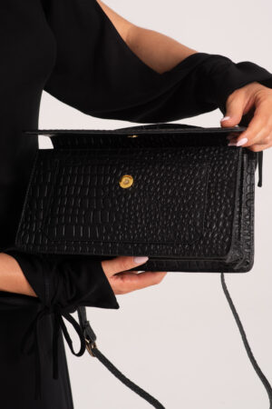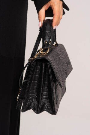 Uszyta z czarnej skóry tłoczonej we wzór skóry krokodyla.